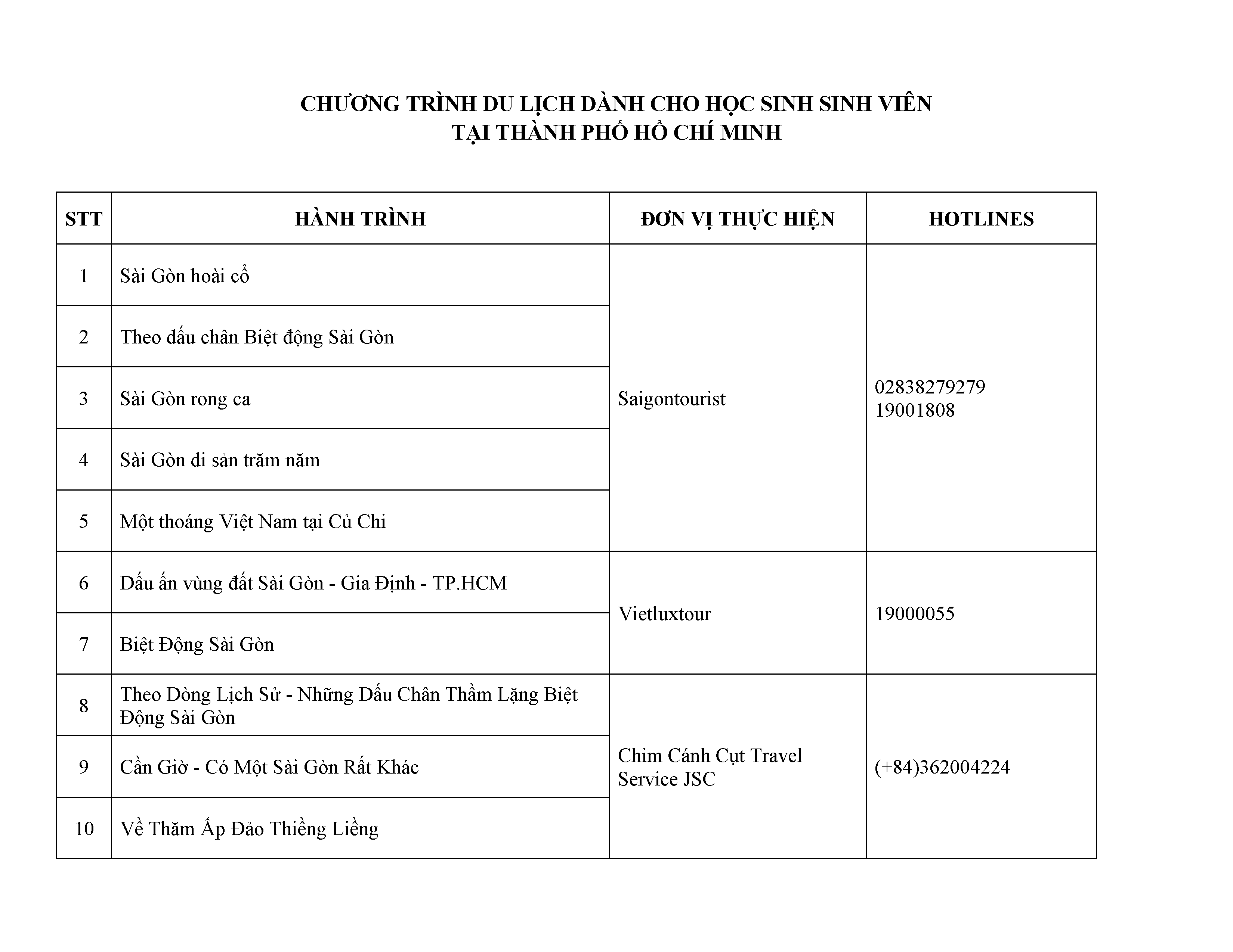 Chương trình tham quan dành cho học sinh sinh viên tại Thành phố Hồ Chí Minh File đính kèm: 1. danh_sach_tour_.pdf