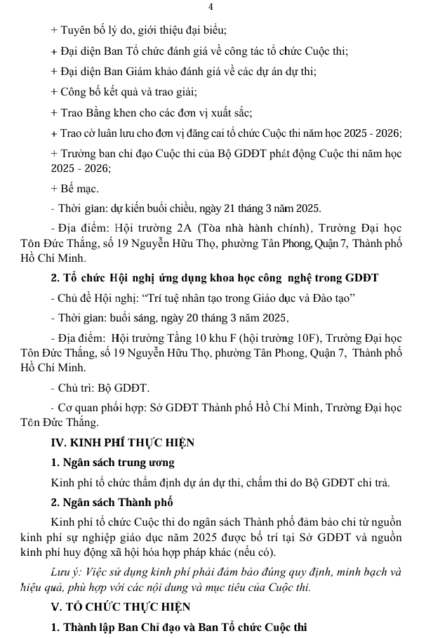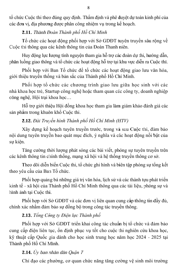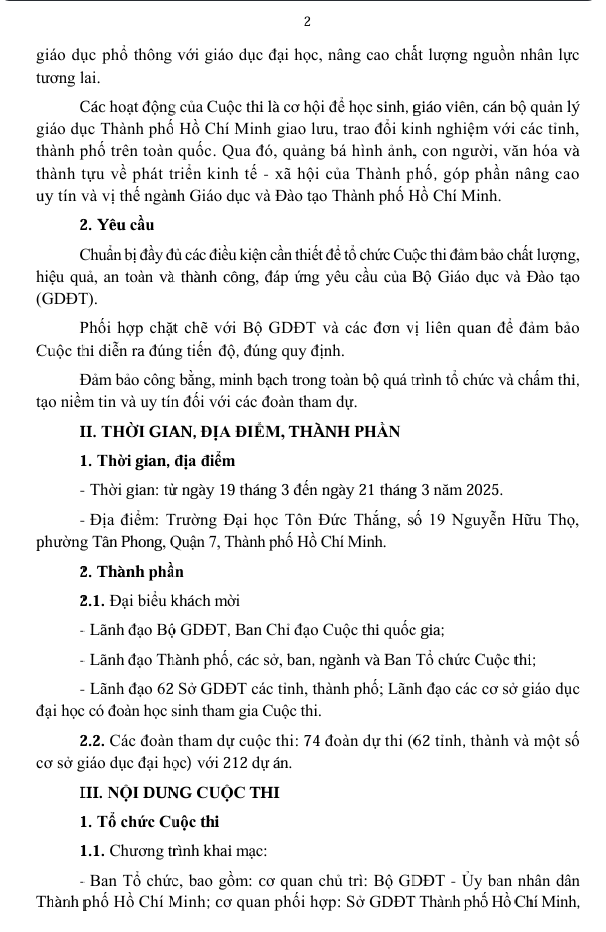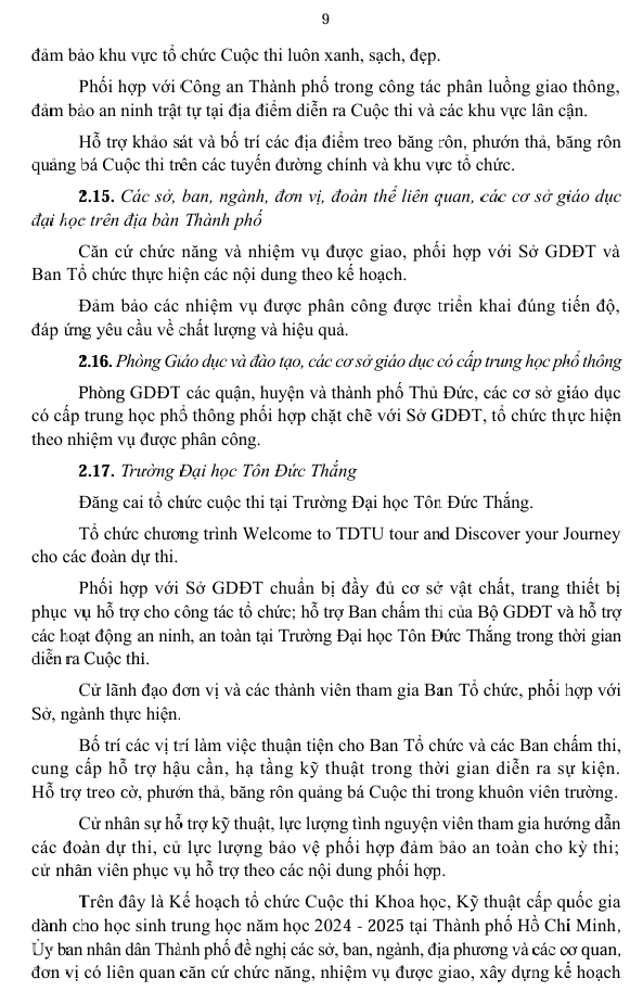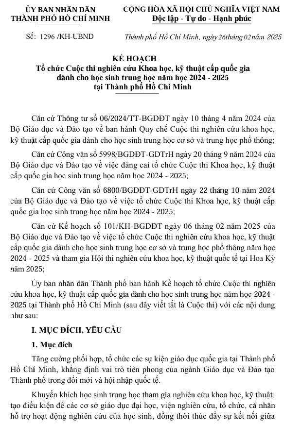 Kế hoạch tổ chức Cuộc thi năm học 2024 - 2025 của Ủy ban nhân dân Thành phố Hồ Chí Minh File đính kèm: 1. 25022025_kh_khkt_quoc_gia_2025__v2_signed_.pdf