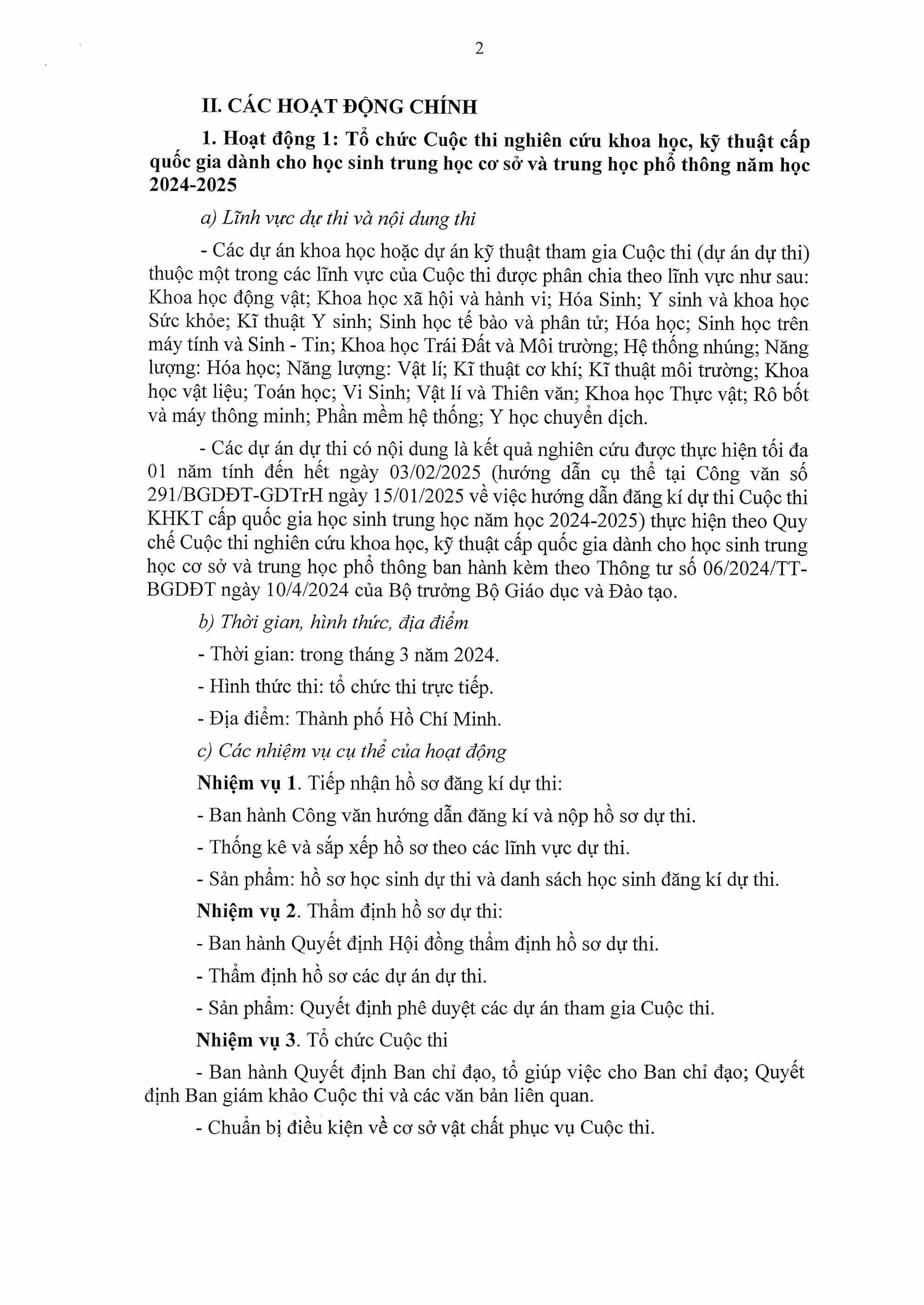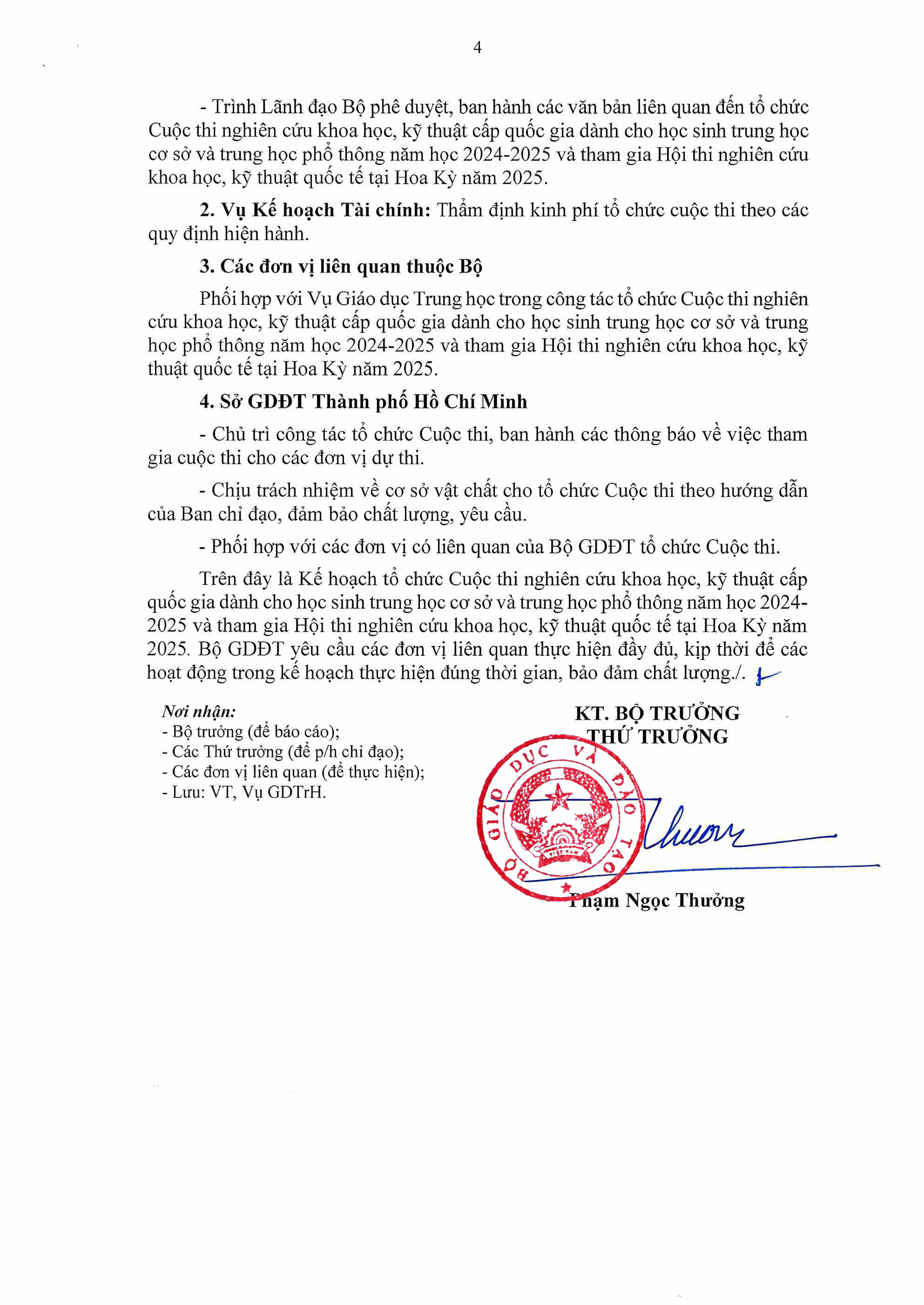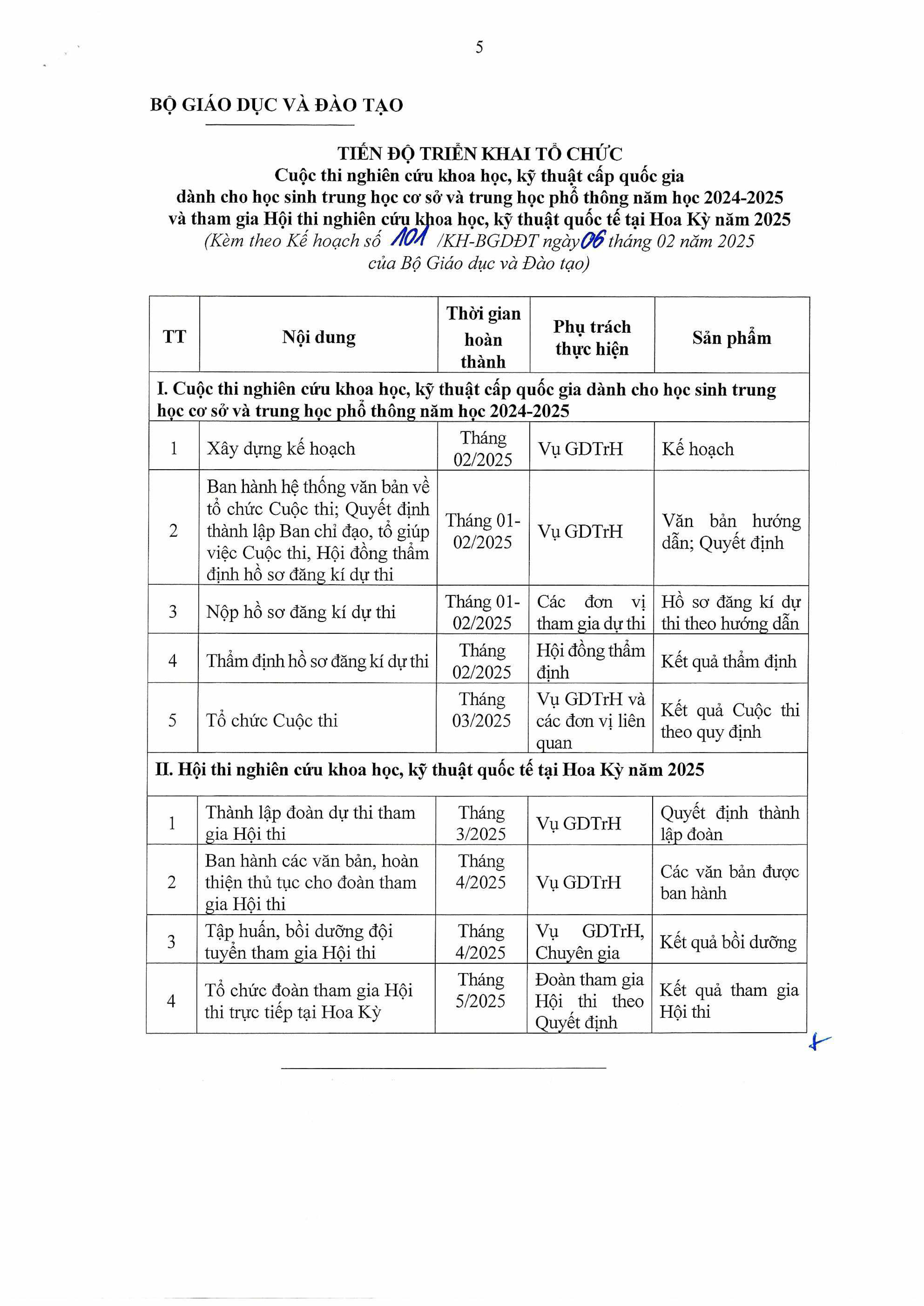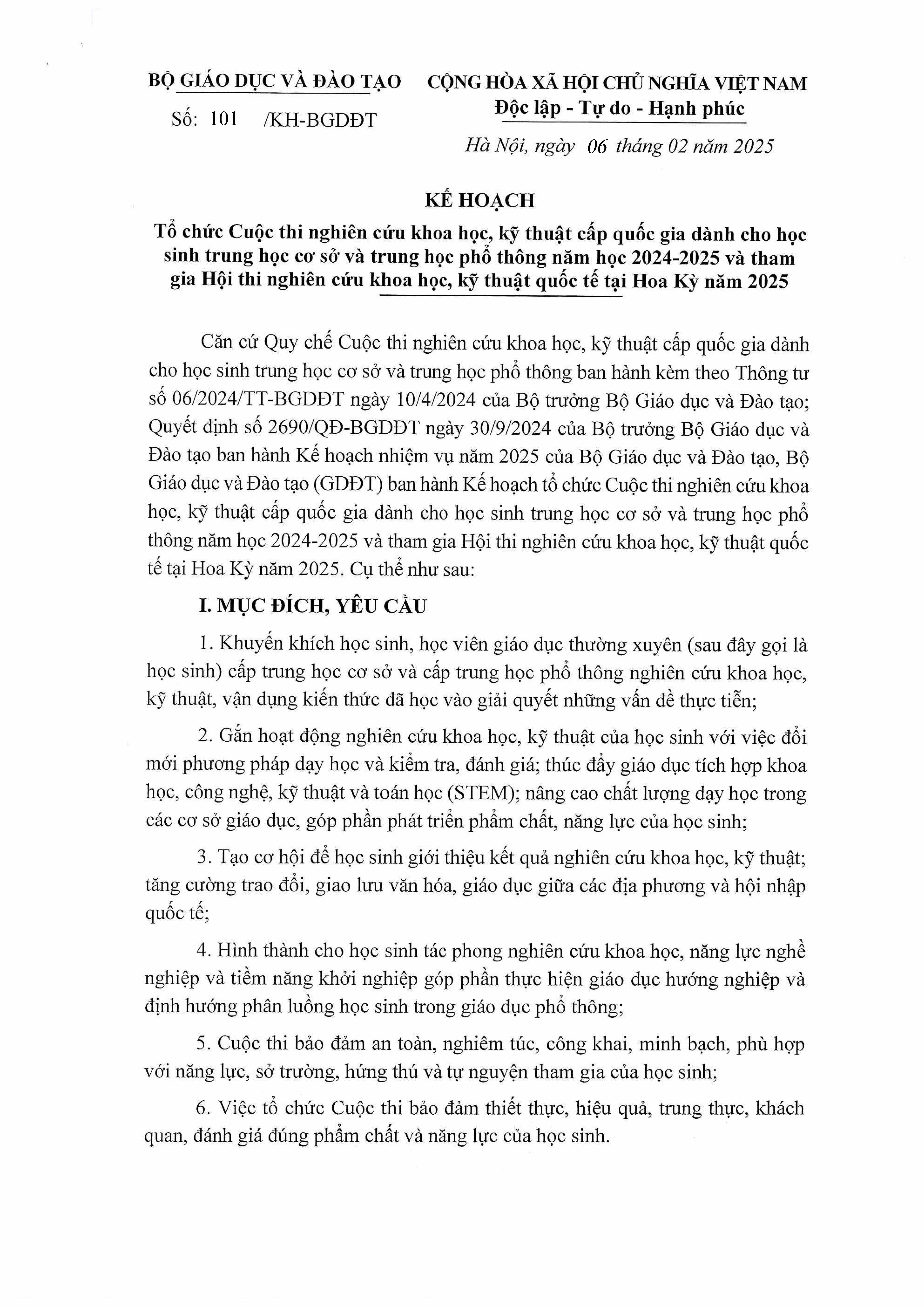 Kế hoạch tổ chức Cuộc thi năm học 2024 - 2025 và tham gia Hội thi nghiên cứu KHKT quốc tế tại Hoa Kỳ năm 2025