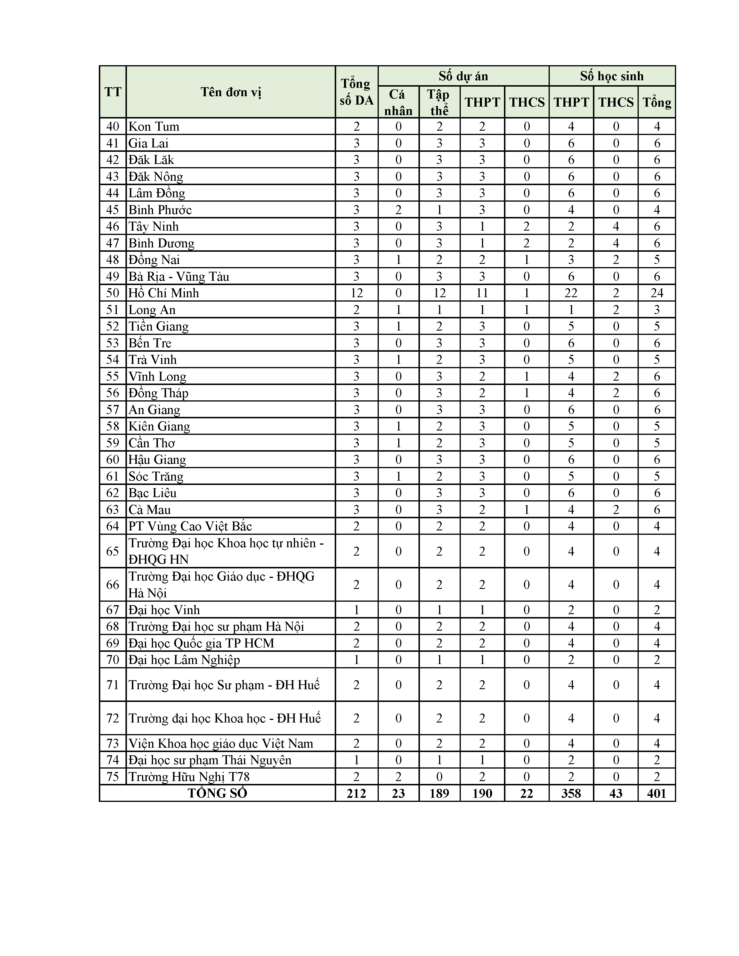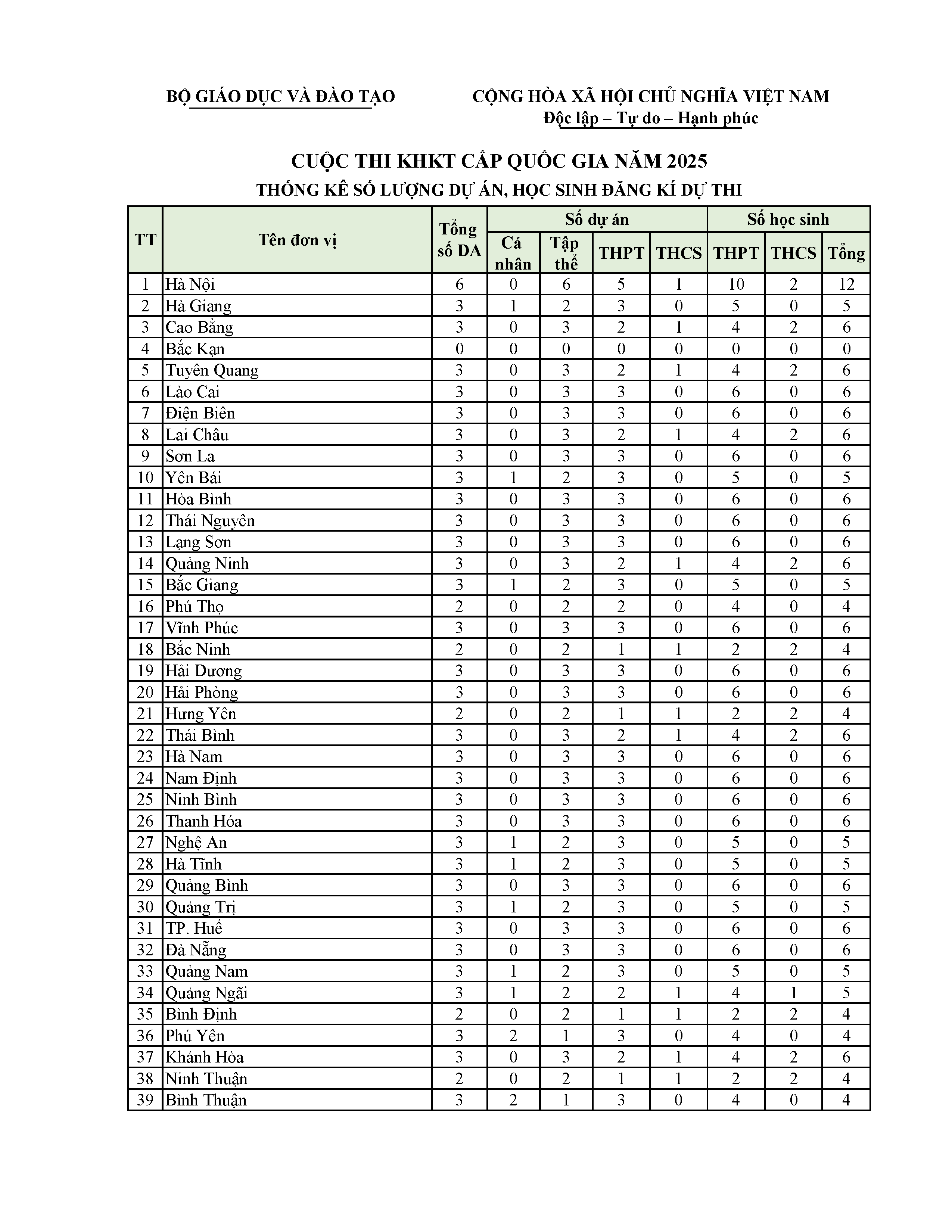 ViSEF năm học 2024 - 2025 - Số lượng dự án, học sinh đăng ký dự thi